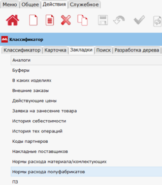 Закладки классификатора. «Нормы расхода полуфабрикатов». Показывает количество деталей/заготовок/полуфабрикатов/сборок в составе изделия, сгруппированных по артикулам и просуммированных по количеству.