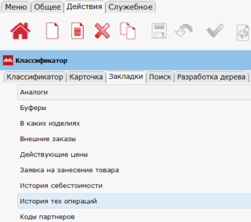 В истории техопераций стало возможным делать отбор по детали. Также историю выполненных техопераций можно посмотреть через классификатор через закладку «История техопераций». Она показывает историю выполненных тех операций по компоненту (детали, сборке, полуфабрикату).