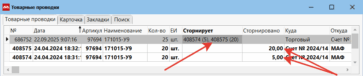 Система выполнит сторнирование и в колонке «Сторнирует» покажет номера проводок, которые сторнированы, а в скобках количество товара. В колонке «Сторнировано» для проводок на отгрузку товара будет указано количество сторнированного товара.