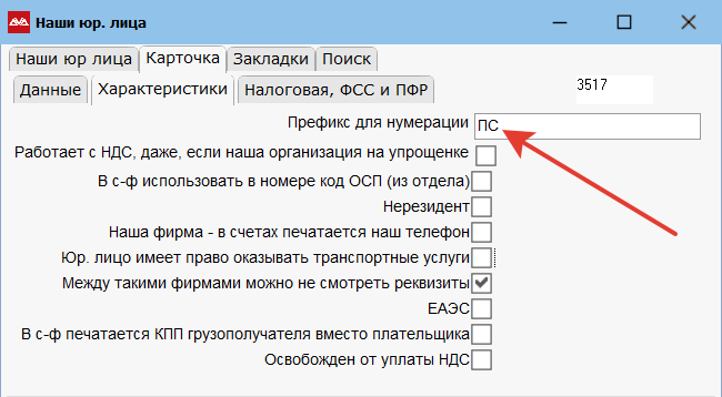 Если в документах нужен префикс в разрезе юр лиц. Идем в Главное меню → Банк и банковские реквизиты → Наши юр лица. Здесь указываем префикс юр лица. Для этого на юр лице нажимаем F2. Переходим в «Характеристики» и указываем префикс.