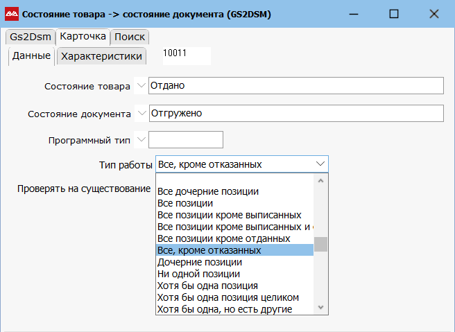 «Все позиции кроме отданных» — движение документа произойдет тогда, когда все позиции перейдут в состояние, указанное в Состоянии товара, кроме тех позиций, которые уже находятся в состоянии «Отдано».