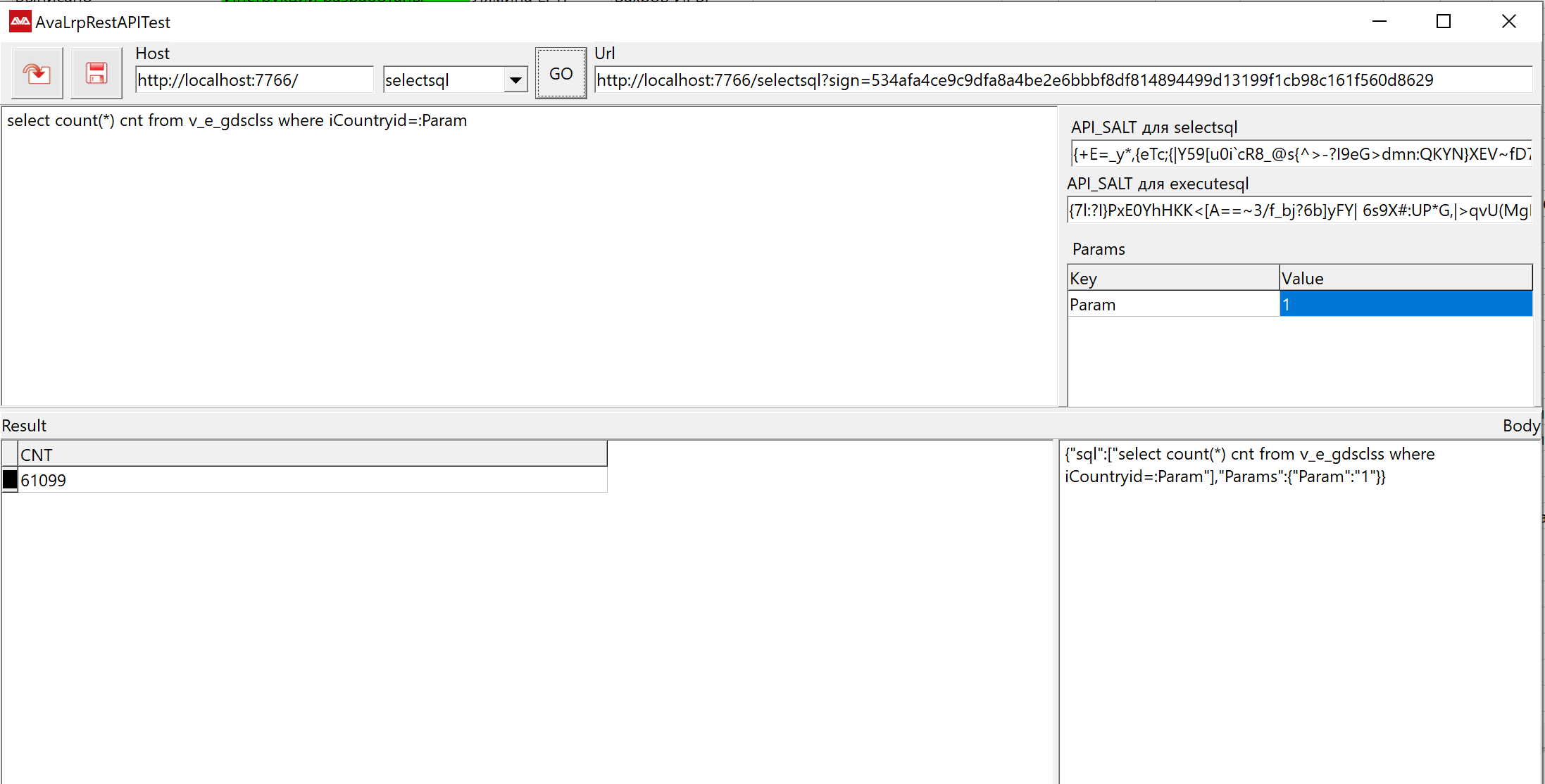 возвращает кол-во стран с кодом страны = 1 - http://localhost:7766/executesql?sign=f95c12ba64d4e02d9f73e896bf00dd579b12ad45f800587fb9612f7d663a56c7