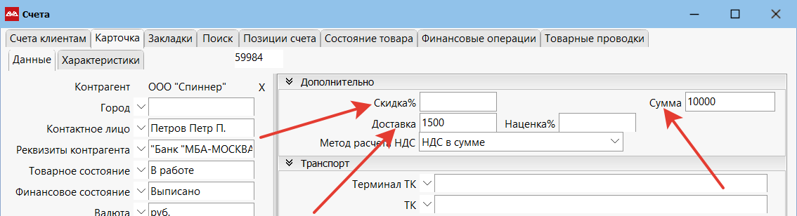 Скидка, доставка указывается непосредственно на карточке документа, по которому предоставляется скидка. Для этого перейдите на карточку документа и внесите в нужное поле необходимое значение.