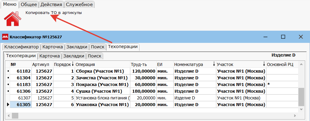 Отметьте пробелом техоперации, которые нужно скопировать, или нажмите CTRL+A, если копируете все ТО. Затем нажмите Меню → Копировать ТО в артикулы.