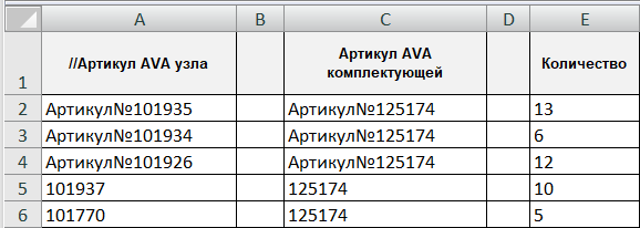 Артикул AVA узла (колонка А). Внутренний артикул узла/детали/изделия из классификатора, может быть указан как числовое значение (101937) или как ссылка на артикул (Артикул№101926).