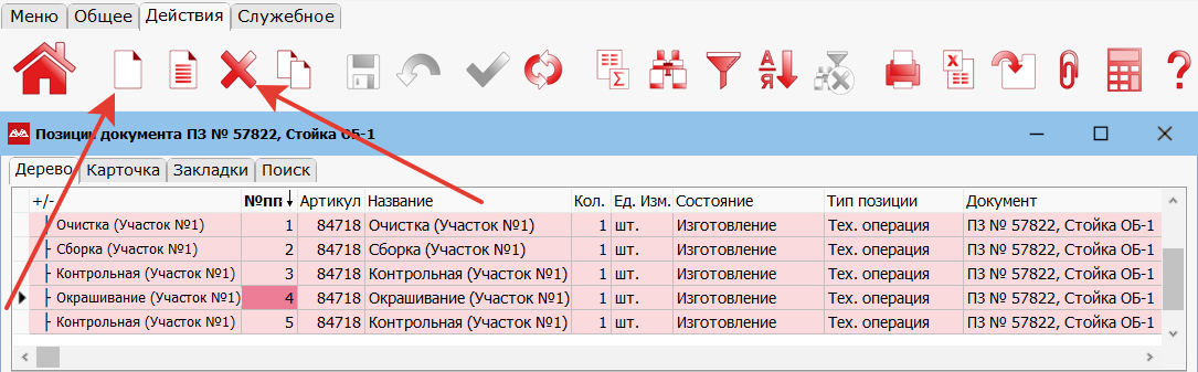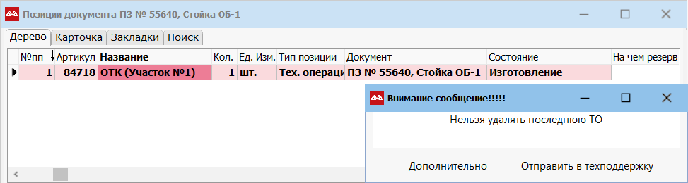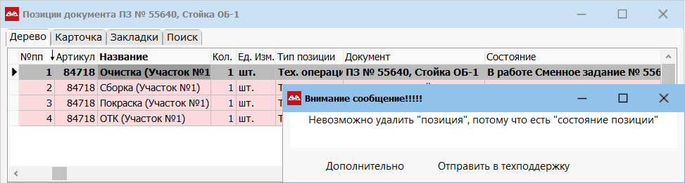 - удалять техоперацию можно при условии, что ВСЯ техоперация в состоянии «Изготовление». То есть не выдавалось СЗ и не закрывалось. Иначе система покажет сообщение «Невозможно удалить “позиция”, потому что есть “состояние позиции”».