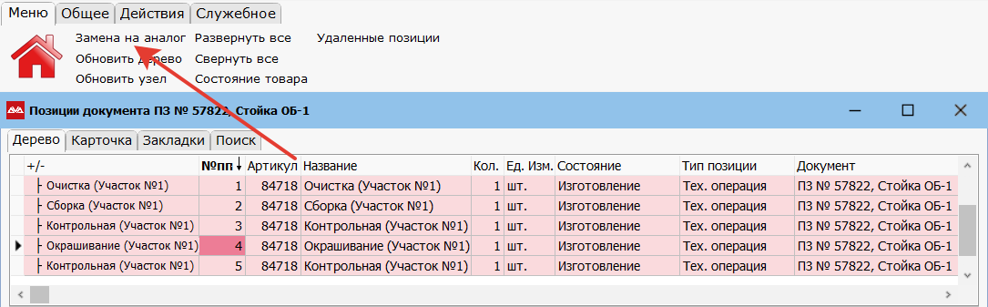 Для замены на аналог перейдите в «Техоперации», как показано на картинке внизу. Либо стоя на на нужном ПЗ перейдите в «Закладки», выберите пункт «Техоперации», далее нажмите Меню → Дерево (F5).