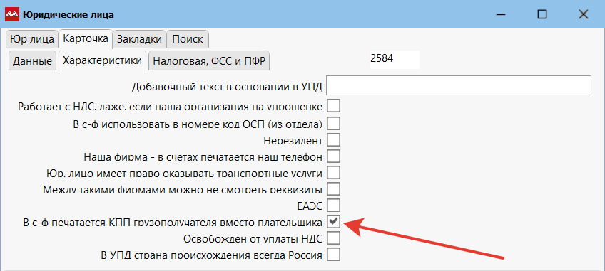Если требуется чтобы в счете-фактуре в графе «ИНН/КПП покупателя» проставлялись «ИНН/КПП грузополучателя», необходимо на карточке юридического лица — покупателя на закладке «Характеристики» поставить галочку «В с-ф печатается КПП грузополучателя вместо плательщика».