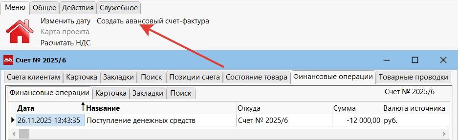 Чтобы создать документ «Авансовый счет-фактура», находясь на счете клиенту, перейдите в закладку «Финансовые операции». Позиционируйтесь на нужной проводке нажмите Меню → Создать авансовый счет-фактура.