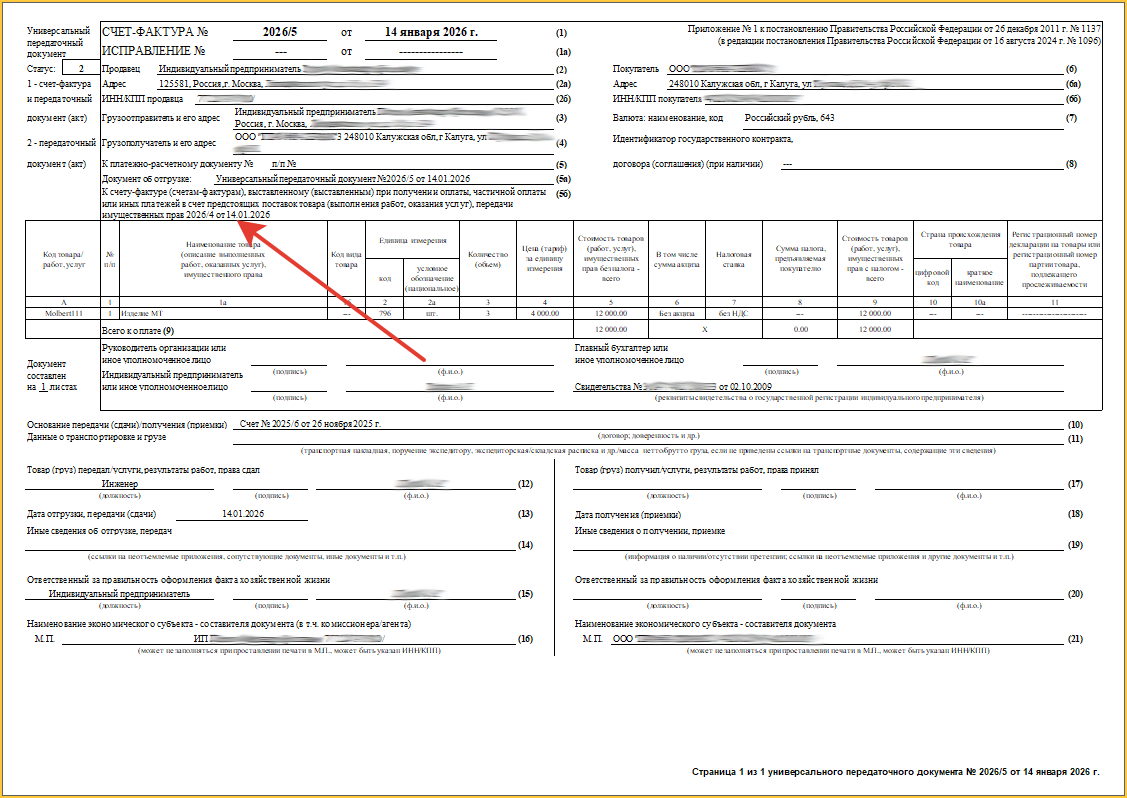 После отгрузки товара клиенту, номер(а) авансового(ых) счетов-фактур отразятся в строчке (5б) УПД.