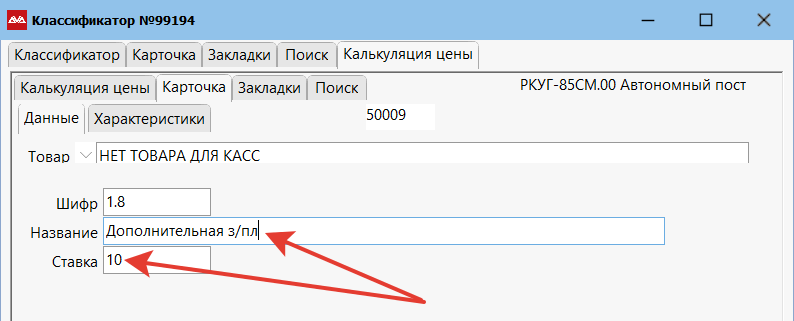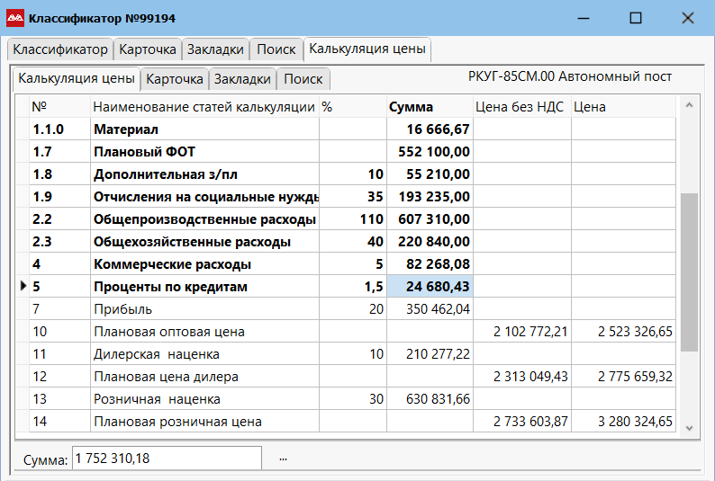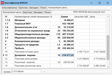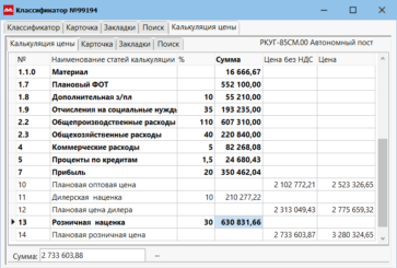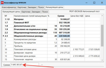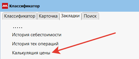 Калькулятор цены — это автоматизированная система ценообразования на основе правил. Находясь на артикуле в классификаторе, переходим в «Закладки» и выбираем пункт «Калькуляция цены».