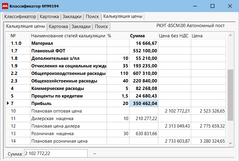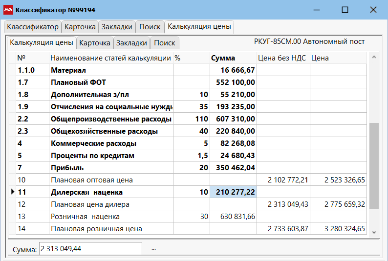 - 10 «Плановая оптовая цена» в колонке «Цена без НДС» показывает сумму строк, расположенных выше.