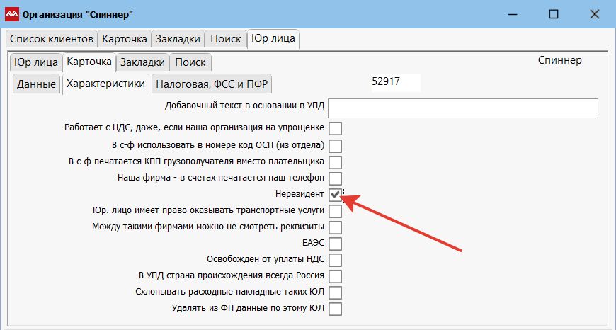Заносим организацию, заносим юридические лицо. Затем на карточке юридического лица, в «Характеристиках» ставим галочку «Нерезидент», как показано ниже.
