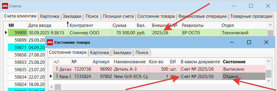 «Отгружен частично». В выборку попадут счета, по которым хотя бы одна позиция находится в состоянии «Отдано», при этом остальные позиции документа могут находиться в других состояниях.