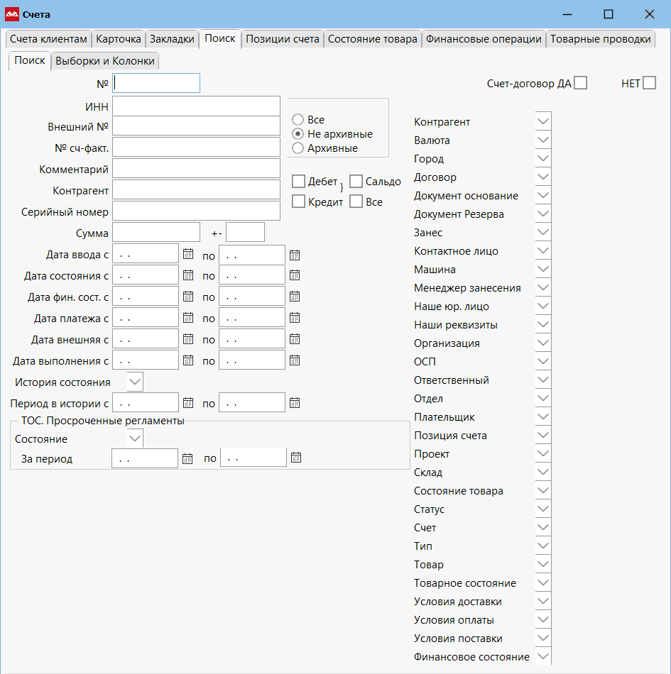 «Нет позиций». Выборка покажет список счетов, в которых нет товарных позиций.