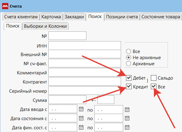 На первой странице поиска вы видите несколько функциональных галочек. Если вы нажмете на одну из этих галочек, то система выведет колонку в список счетов с соответствующим значением. Например, если вы поставите галочку «Сальдо», то система отразит в списке счетов колонку с разницей сумм отгрузки и сумм оплаты.