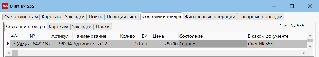 Для возврата товара на склад, находясь на нужной позиции в «Состоянии товара» в счете клиента, выполните движение товара «Разрешено к возврату».