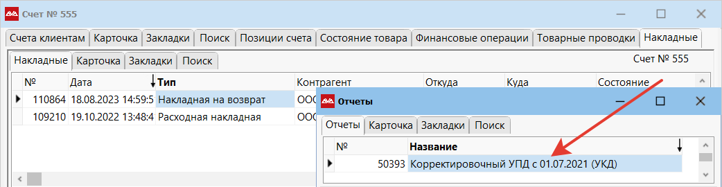 После этого на возвратной накладной можно распечатать корректирующий УПД (Отчет№50393 «Корректировочный УПД с 01.07.2021 (УКД)»).