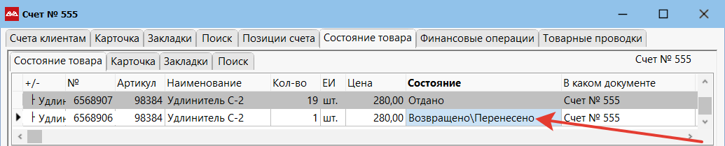 Товар в счете перейдет в состояние «Возвращено/Перенесено». Таким образом, клиент вернул нам купленный товар.