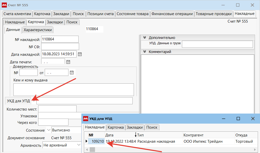 На возвратной накладной можно сформировать корректировочный УПД. Для этого на карточке возвратной накладной по кнопке «УКД для УПД» нужно выбрать ту накладную, по которой был отгружен товар клиенту.