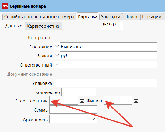 Если дата финиша не заполнена, то она вычисляется, по формуле: старт гарантии + срок гарантии в классификаторе. А если гарантия указана на карточке позиции в документе, то считаем по ней.