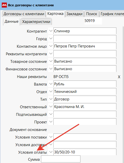 «Условие оплаты» (с отсрочкой) можно также указать единожды на карточке организации, тогда в документы оно будет подставляться автоматически.