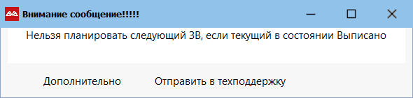 Если звонок-встреча находится в состоянии «Выписано» и поле «Дата следующего контакта» заполнено, система не позволит сохранить и выведет на экран сообщение «Нельзя планировать следующий ЗВ, если текущий в состоянии Выписано».