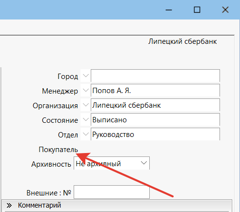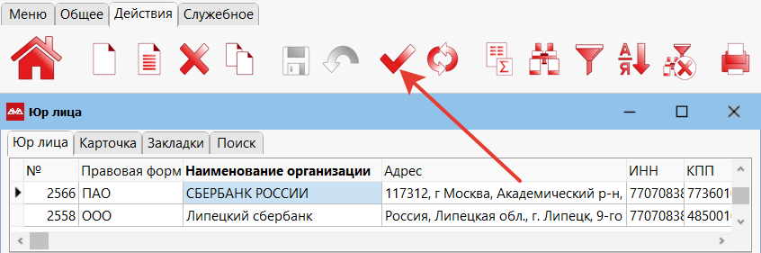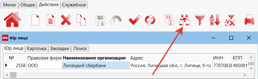 Теперь ваша задача — на карточке юр. лица «Липецкого Сбербанка» указать в качестве плательщика юр. лицо «Сбербанка России» (головной компании). Для этого, находясь на «Липецком Сбербанке», перейдите в «Закладки» и выберите пункт «Юр лица». На карточке юр. лица нажмите на кнопку «Покупатель».