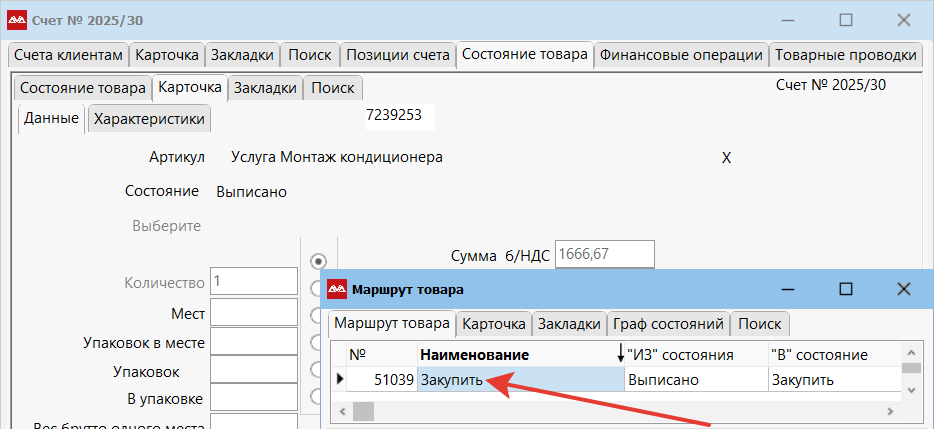 В позиции счета клиента, к которому выполняете привязку, занесите услугу. Перейдите в «Состояние товара», нажмите корректировать запись (F2) и выберите движение «Закупить». Сохраните запись.