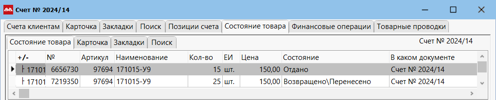 После того, как вы вернете 25 штук товара на склад, «Состояние товара» будет выглядеть так: