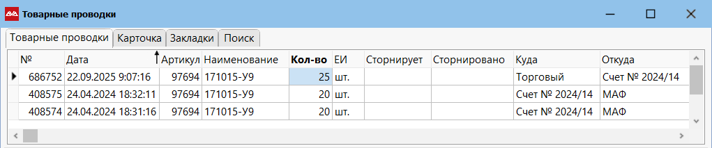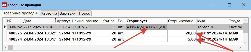 Нажимаем Enter и видим «Товарные проводки». В нашем примере отгружали товар двумя проводкам по 20 штук (две нижние строки). Верхняя строка — проводка на возврат.
