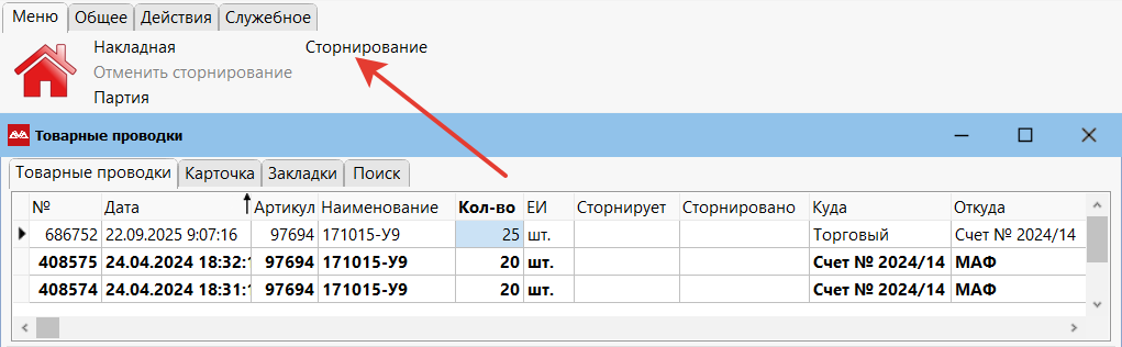 Так как количество возвращаемого товара превышает каждую проводку в отдельности, помечаем пробелом обе проводки на отгрузку товара и ставим фокус на проводку на возврат, нажимаем Меню → Сторнирование.