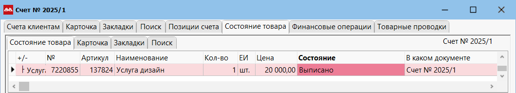 Для фиксации факта оказания услуги, ее необходимо отдать. Для этого нужно открыть состояние товара в документе (счете, заказе).