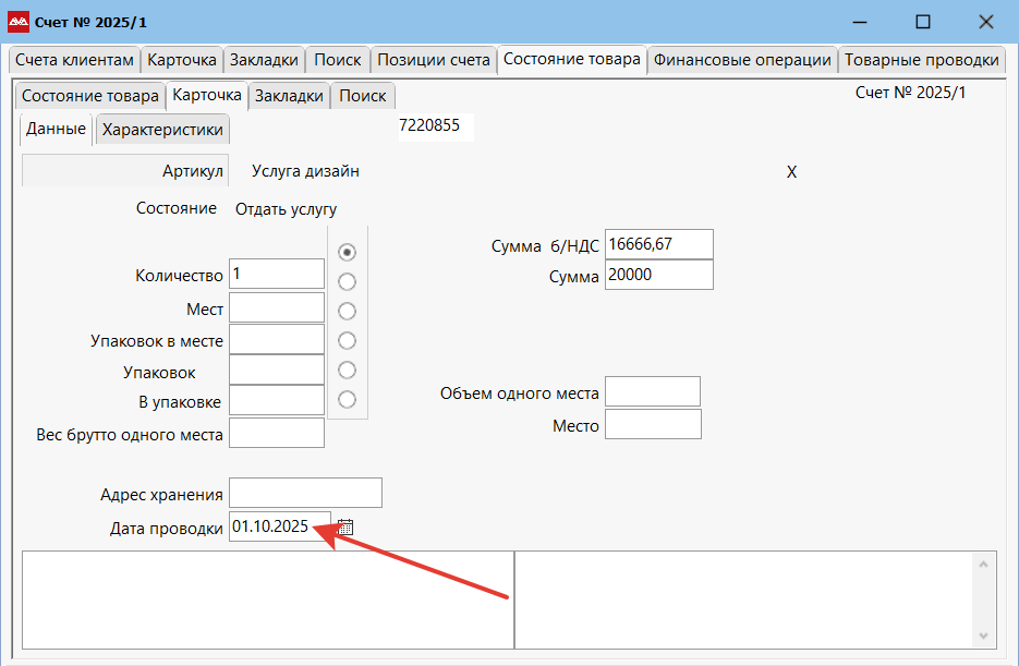 После выбора движения, вы можете указать дату оказания услуги в поле «Дата проводки». Если не указать, то услуга будет оказана текущим днем.
