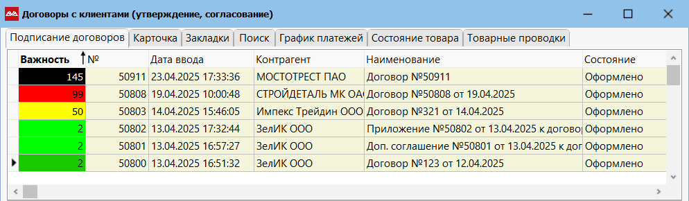 В этом пункте меню каждый из согласующих видит только те договоры, за согласование которых он отвечает, а так же видит приоритет, то есть важность (колонка «Важность»). Самые важные расположены сверху. Сотрудник заходит в этот список, видит по степени важности какой договор согласовать важнее и им занимается.