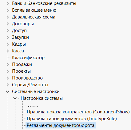 Переходим в Главное меню → Системные настройки → Настройка системы → Регламенты документооборота.