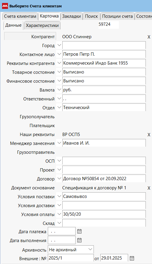 Если на этого контрагента есть незакрытые счета, то они покажутся на экране. Вы можете добавить отмеченные позиции в один из существующих счетов. Для этого просто двойным кликом выберите нужный счет. Если таких счетов нет, то откроется карточка нового счета. Заполните ее.