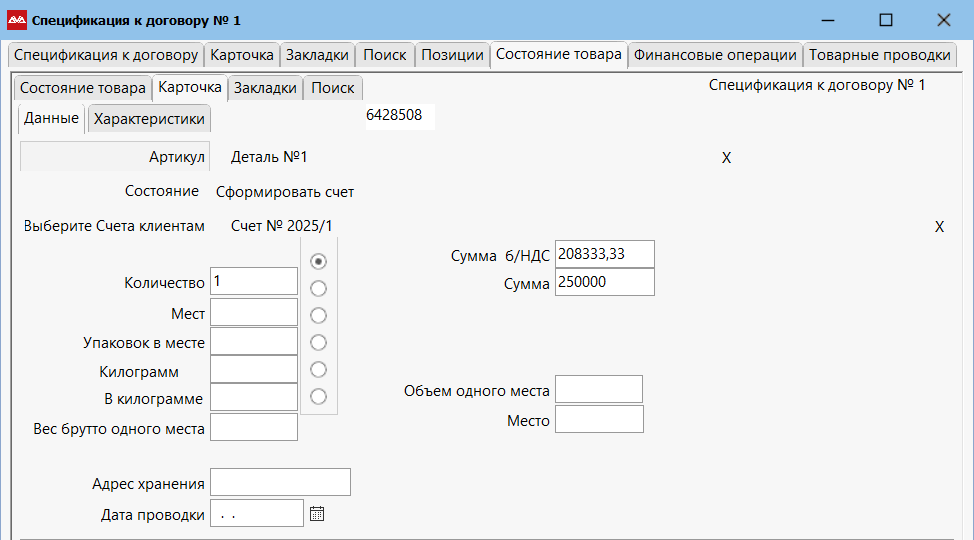 Вы занесли спецификацию к договору с клиентом, наполнили ее позициями. Теперь из спецификации выставим счет на оплату. Для этого находясь на спецификации, нажмите F6. Отметьте пробелом те позиции, на которые нужно выставить счет. Если все позиции нужно отметить — нажмите Ctrl+A.