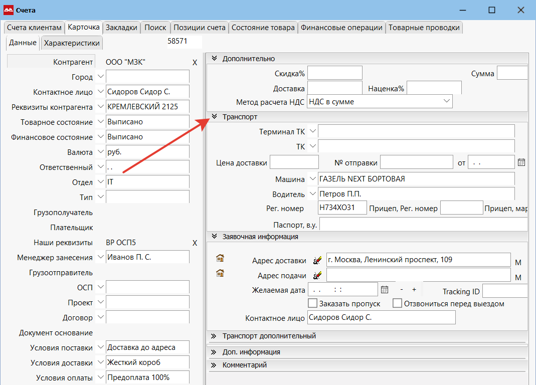 В соответствии с выбранным условием заполняем доставочные поля на карточке счета. Заносим ту информацию по доставке, которая нам известна на момент занесения счета. Сохраняем запись.