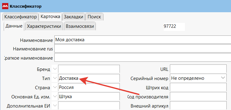 Если же доставка должна фигурировать отдельной строкой в счете, то сначала нужно доставку занести в классификатор как услугу и на карточке этой услуги выбрать тип № 19 «Доставка». Именно по этому типу система идентифицирует позицию доставка в счете и в нее проставляет сумму, указанную на карточке счета.