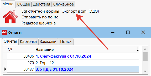 Нажимаем Меню → Экспорт в xml (ЭДО). Указываем путь. Система создаст два файла: ТОРГ-12 и Счет-фактуру по накладной.