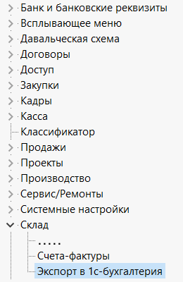 Главное меню → Склад → Экспорт в 1C-бухгалтерия.