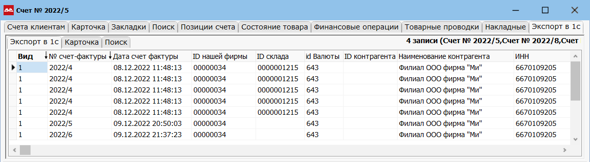 Для примера выгрузим так реализации. Чтобы сформировать файл выгрузки, переходим в список счетов. Встаем на нужный счет или отмечаем пробелом счета, если их несколько, по которым хотим выгрузить реализации.