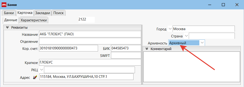 открыть для корректирования запись по нужному вам банку и проставить ему признак «Архивный».