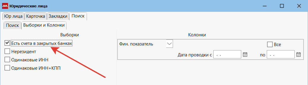 На вкладке «Выборки и колонки» формы поиска в юридических лицах можно поставить галочку в поле «Есть счета в закрытых банках» и запустить этот поиск. В результате программа выведет на просмотр все юридические лица, у которых есть такие счета.