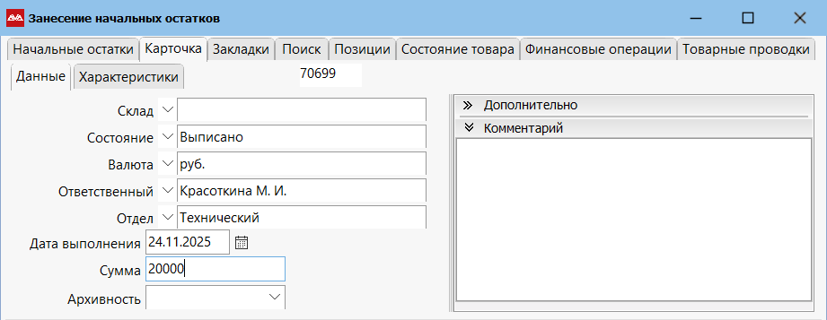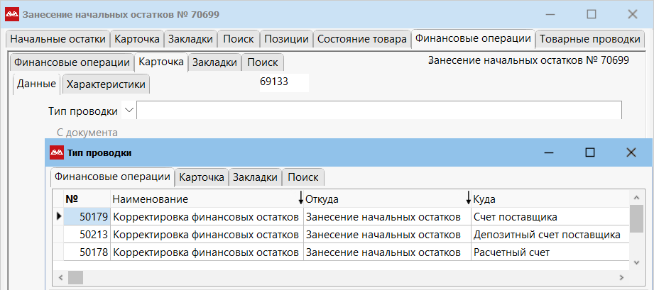 Если вы выбрали 50178 «Корректировка финансовых остатков (Куда — Расчетный счет)», система предложит выбрать расчетный счет организации, выберите нужный. Остальные поля будут заполнены автоматически.