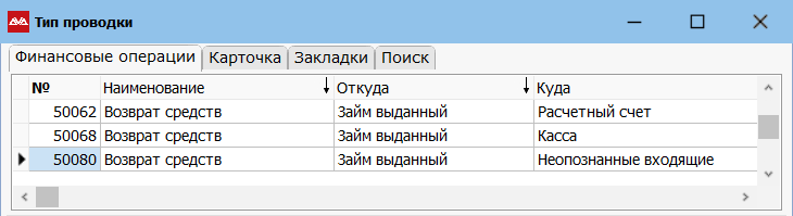Чтобы сделать возврат займа нужно перейти на вкладку «Финансовые операции» и выполнить финансовую операцию №50080 «Возврат средств» (Неопознанные входящие), либо №50068 (Касса), либо №50062 (Расчетный счет).