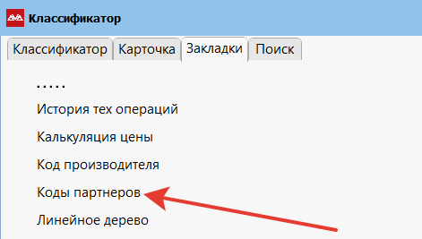 Для занесения артикула поставщика, находясь на товарной позиции в классификаторе, перейдите в «Закладки»