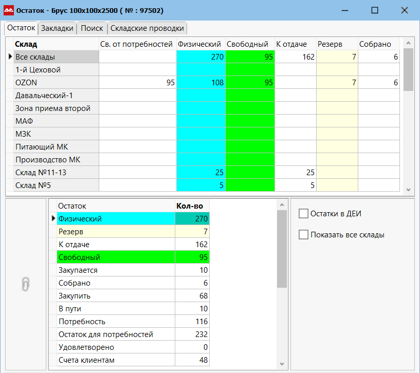 По умолчанию в этой форме показываются все склады, кроме складов брака. Если нажать галочку «Показать все склады», то покажутся все склады.