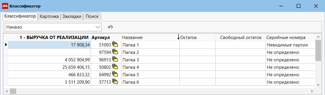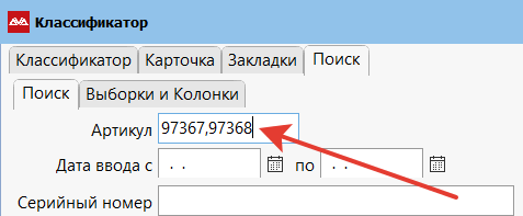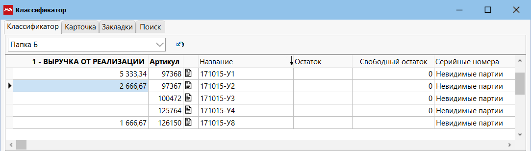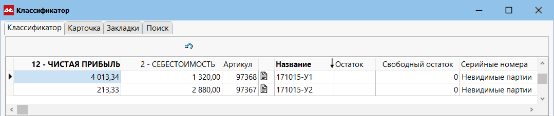 Чтобы увидеть эту информацию, зайдите в классификатор (Главное меню → Классификатор) и выберите через «Поиск» нужные артикулы.